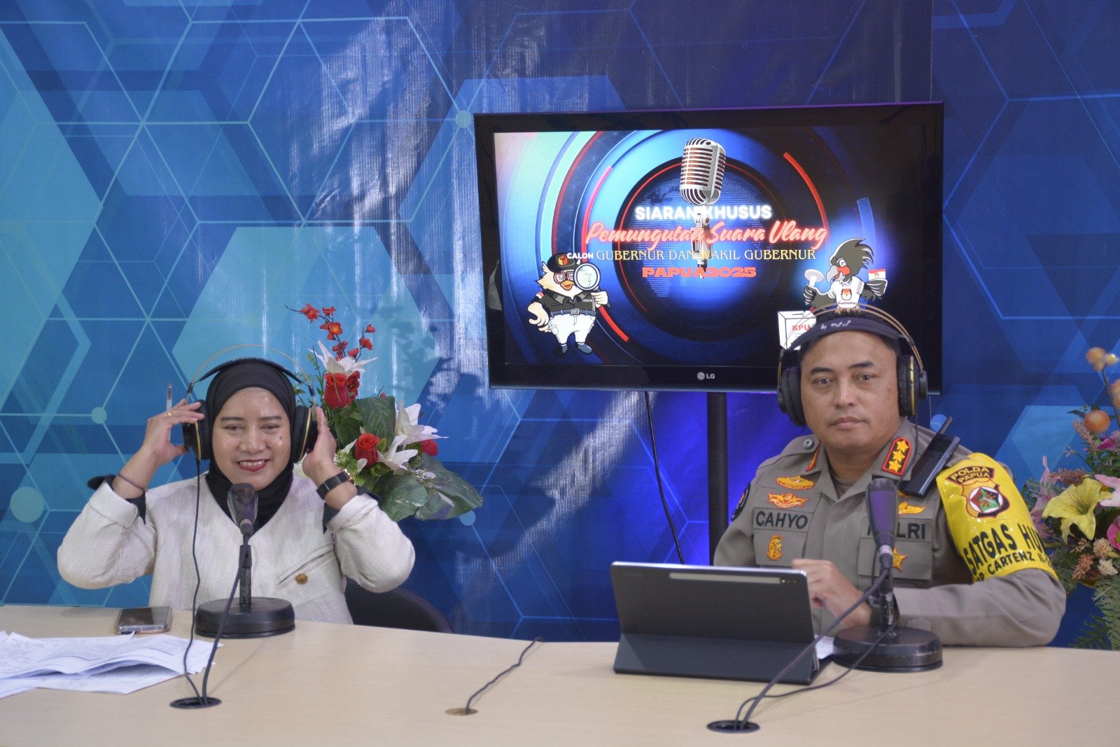 Papua – Dalam rangka memberikan informasi dan edukasi kepada masyarakat terkait pelaksanaan Pemungutan Suara Ulang (PSU) Pemilihan Gubernur dan Wakil Gubernur Papua tahun 2025, Kabid Humas Polda Papua Kombes Pol Cahyo Sukarnito, S.I.K., M.K.P. menjadi narasumber dalam program “Siaran Khusus PSU Pilgub Papua” yang disiarkan langsung oleh RRI Jayapura, Pro 1, Rabu (06/08/25).