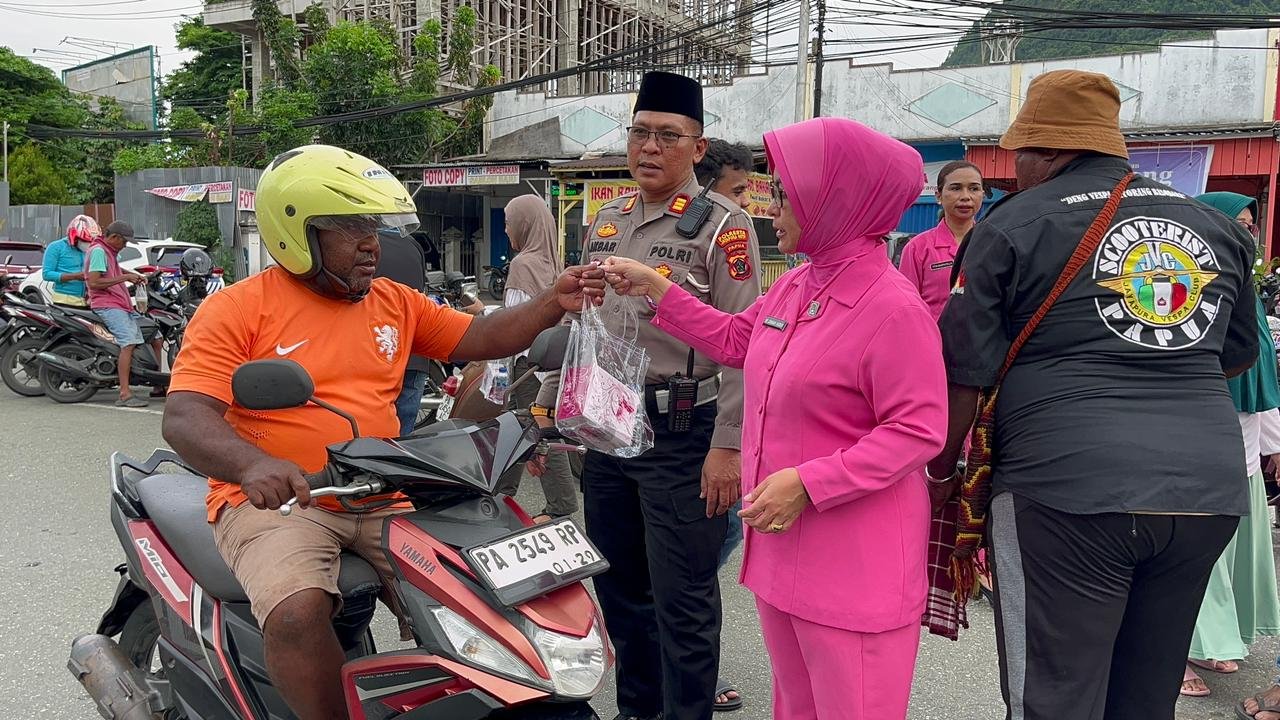 Papua – Dalam rangka menyemarakkan bulan suci Ramadan 1447 H, Satuan Lalu Lintas Polresta Jayapura Kota bersama Bhayangkari Sat Lantas melaksanakan kegiatan berbagi takjil kepada para pengemudi ojek pangkalan, ojek online (ojol), serta pedagang kaki lima di Jalan Irian, tepatnya di depan Taman Imbi, Kota Jayapura, Sabtu (07/03/2026) sore.