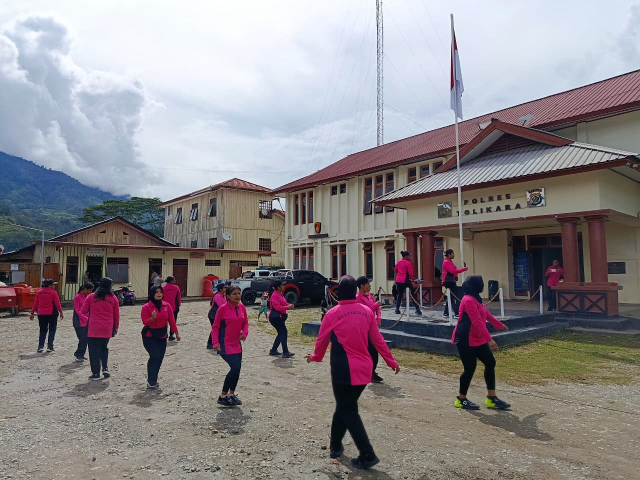 Dalam pelaksanaan kegiatan, para anggota Bhayangkari tampak kompak mengenakan seragam olahraga berwarna merah muda. Mereka mengikuti rangkaian gerakan senam dengan penuh semangat dipandu instruktur dari atas panggung kecil. Suasana ceria semakin terasa dengan latar panorama pegunungan Tolikara yang memberikan udara segar dan menambah kenyamanan selama kegiatan berlangsung.