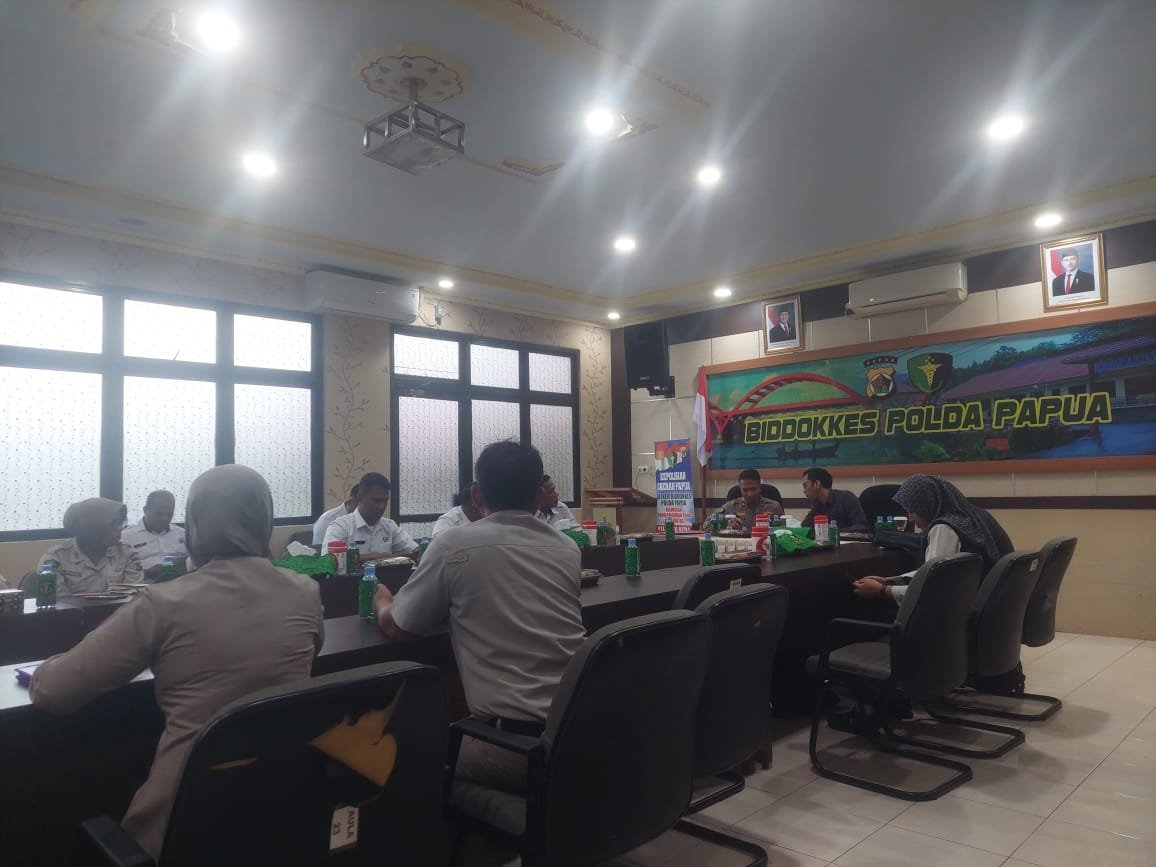 Kegiatan pemeriksaan berlangsung di Aula Biddokkes Polda Papua dan dihadiri oleh Kabiddokkes Polda Papua Kombes Pol dr. Bambang Pitoyo Nugroho, KA Rumkit Polda Papua Dr. Rommy Sebastian, dr., M.Kes., M.H., CPM., QHIA, serta para pejabat dan staf Biddokkes dan Rumkit Polda Papua.
