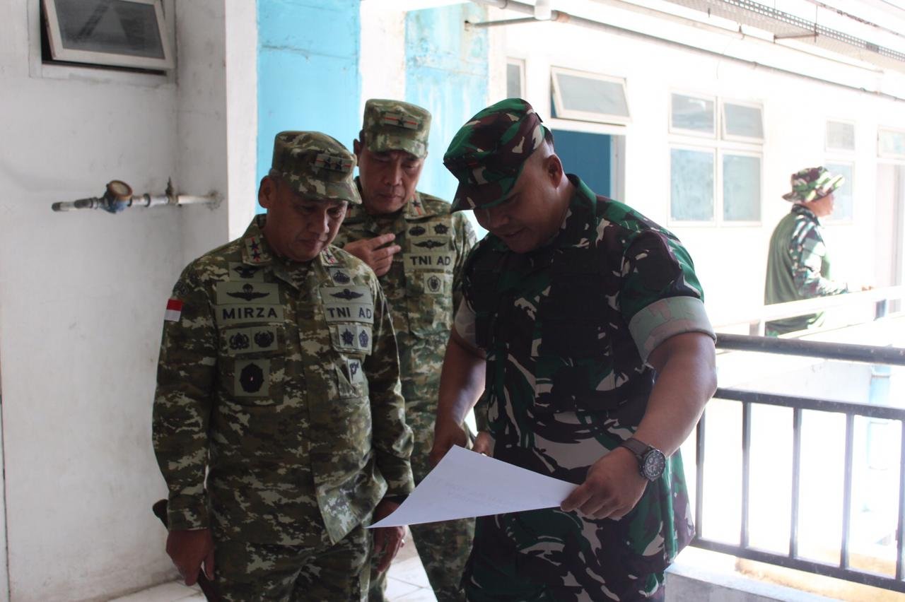 Bitung – Pangdam XIII/Merdeka, Mayjen TNI Mirza Agus, S.I.P., bersama Danrem 131/Stg Brigjen TNI Martin Susilo Martopo Turnip, S.H., M.H., melakukan peninjauan lokasi Marshalling Area (MA) tempat sementara penampungan prajurit Batalyon Teritorial Pembangunan (YTP) 916/Makawidey.