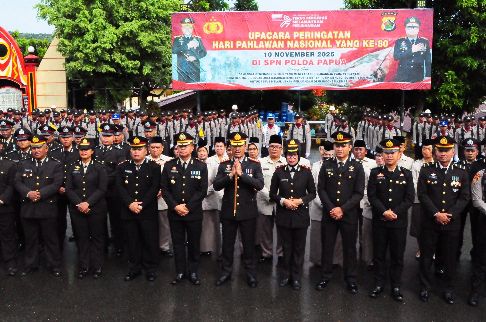 Upacara peringatan Hari Pahlawan Nasional ke-80 Tahun 2025 di SPN Polda Papua berjalan dengan tertib, khidmat, dan penuh semangat nasionalisme, mencerminkan tekad bersama untuk terus meneladani nilai-nilai perjuangan para pahlawan dalam menjalankan tugas dan pengabdian kepada bangsa dan negara.(rd)
