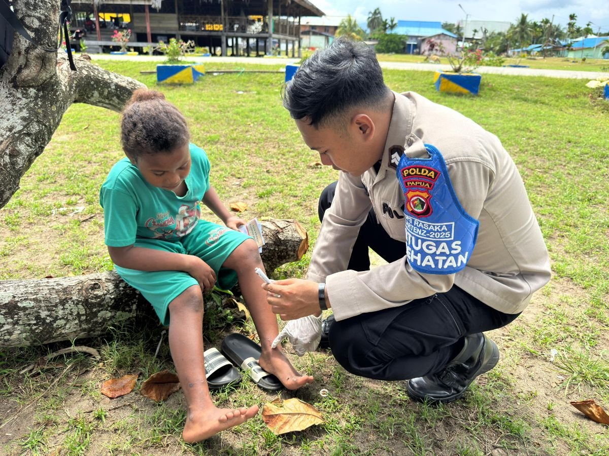 Papua – Operasi Rasaka Cartenz 2025 melalui Subsatgas Keladi Sagu Polresta Jayapura Kota melaksanakan giat bakti kesehatan bagi anak-anak di Kampung Skouw Yambe, dalam kegiatan ini, personel hadir memberikan pengobatan serta membagikan obat-obatan dengan penuh kepedulian.