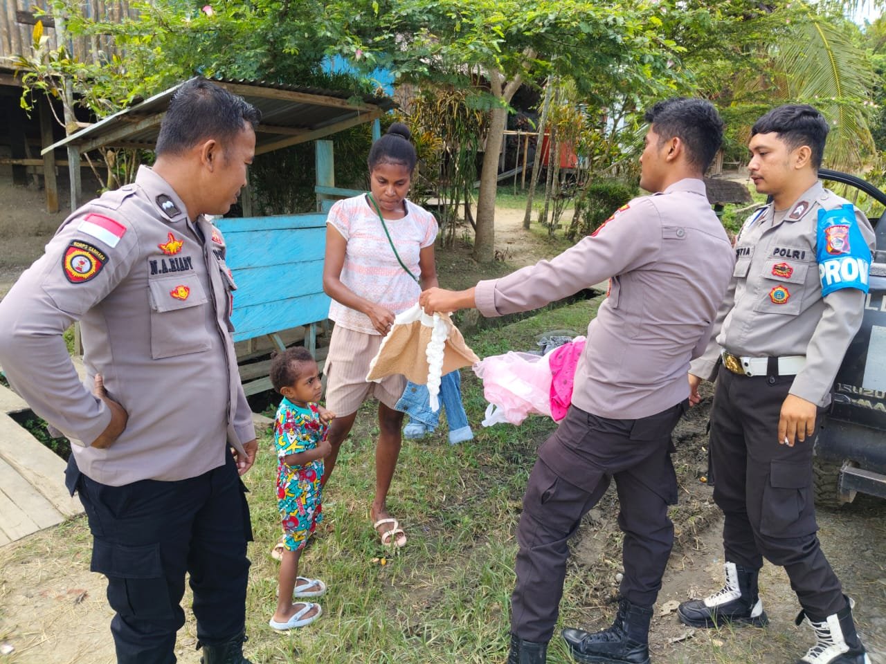 Kegiatan tersebut dipimpin oleh Aipda Nur Ahmad Riyadi bersama Bhabinkamtibmas Kampung Fam Bripka Mufti Nawir, S.H dan personel piket Polsek Waris. Setibanya di Kampung Kali Fam, tim langsung mengumpulkan warga dan mendistribusikan pakaian layak pakai untuk pria dewasa, perempuan dan anak-anak.