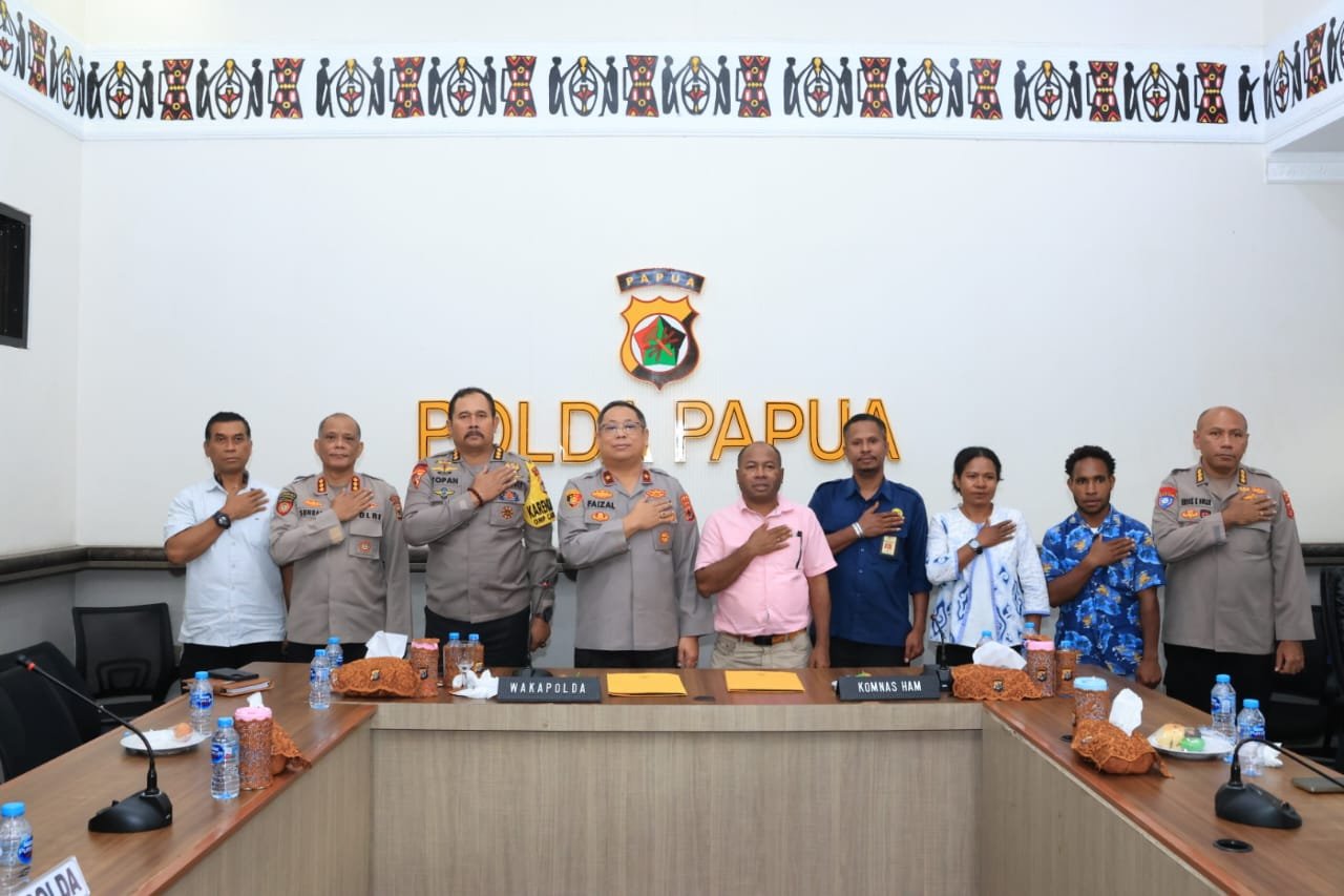 Papua – Dalam rangka memperkuat sinergi jelang pelaksanaan Pemungutan Suara Ulang (PSU) Gubernur dan Wakil Gubernur Papua 2025, Kapolda Papua, Irjen Pol. Patridge R. Renwarin, S.H., M.Si., yang diwakilkan oleh Wakapolda Papua Brigjen Pol. Dr. Faizal Ramadhani, S.Sos., S.I.K., M.H. menerima audiensi dari Tim Komnas HAM RI Wilayah Papua yang dipimpin langsung oleh Ketua Frits B. Ramandey, S.Sos., M.H., bertempat di Aula Cenderawasih, Mapolda Papua, Kota Jayapura, Jumat (01/08/2025).