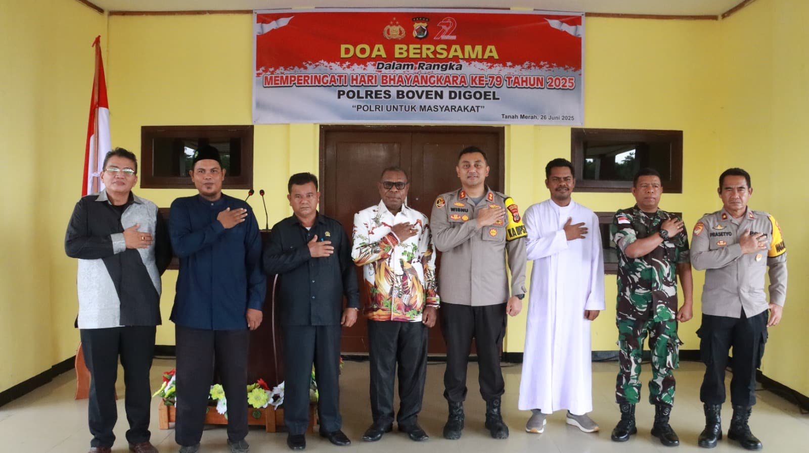 Papua – Dalam rangka memperingati Hari Bhayangkara ke-79, Polres Boven Digoel menggelar kegiatan Doa Bersama Lintas Agama yang berlangsung khidmat di Lobi Kantor Polres Boven Digoel, Kamis (26/06/2025). Kegiatan ini dihadiri oleh jajaran pejabat daerah, tokoh agama, serta masyarakat setempat sebagai bentuk refleksi spiritual dan wujud sinergi antara Polri dan elemen masyarakat.