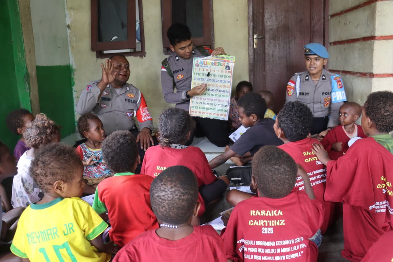 Papua – Polri terus berkomitmen meningkatkan kualitas pendidikan yang rutin dilaksanakan melalui Program Polisi Pi Ajar. Hal inilah yang dilakukan jajaran anggota Polisi di Kabupaten Yahukimo, Papua Pegunungan dengan mengajarkan anak-anak binaannya di jalan Sosial Distrik Dekai Kabupaten Yahukimo, Selasa (9/9/25).