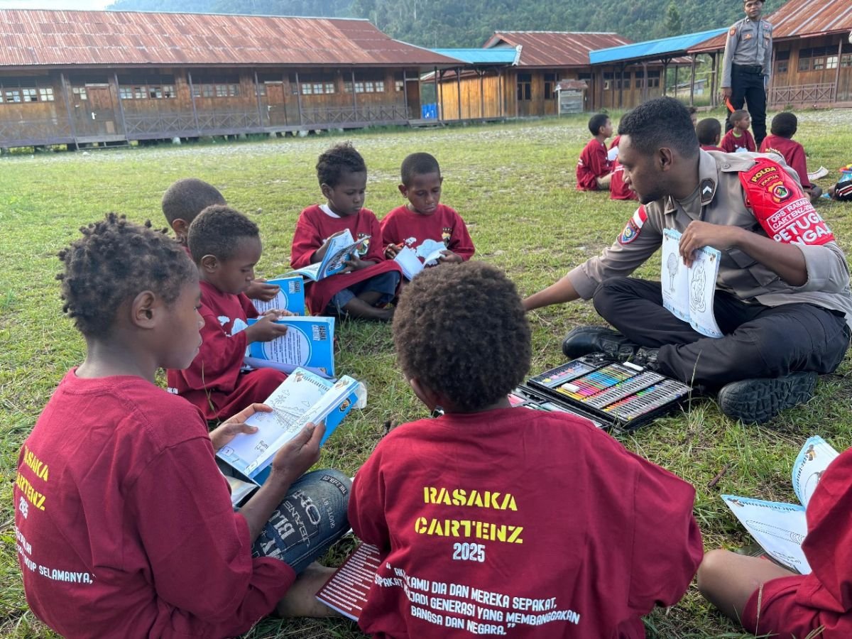 Papua — Program Si-IPAR (Polisi Pi Ajar), bagian dari Operasi Rasaka Cartenz 2025, Hadir Mengajar Anak-anak Generasi Emas Papua Di Kota Oksibil, kegiatan dilaksanakan di Jln Kabiding Lokasi 1 Distrik Oksibil, Kabupaten Pegunungan Bintang, Oksibil. Senin (02/06) Sore.