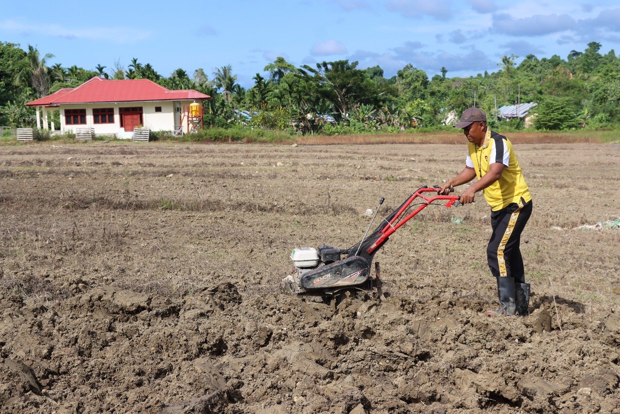 Papua – Sat Binmas Polres Sarmi bersama penyuluh dari Dinas Pertanian Kabupaten Sarmi melakukan kegiatan olah tanah seluas 8000 m² di Lahan depan Mapolres Sarmi. Kegiatan olah tanah ini dilakukan oleh Personil Sat Binmas dengan menggunakan Traktor Roda Dua (TR 2), pada Jumat (23/05/25).
