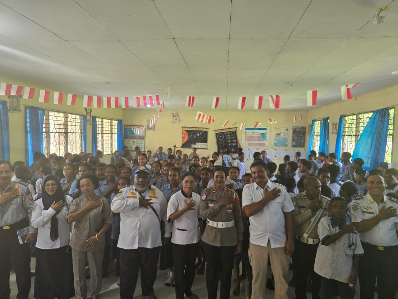 Turut hadir dalam kegiatan ini PLT Kadis Perhubungan Kabupaten Keerom Franklyn Uriagir, SKM., M.Kes, KBO Narkoba IPDA Patar Lumbantoruan, Kepala Sekolah Monika Itu, S.Pd., staf perhubungan serta para guru SMP YPPK Taruna Tegasa.