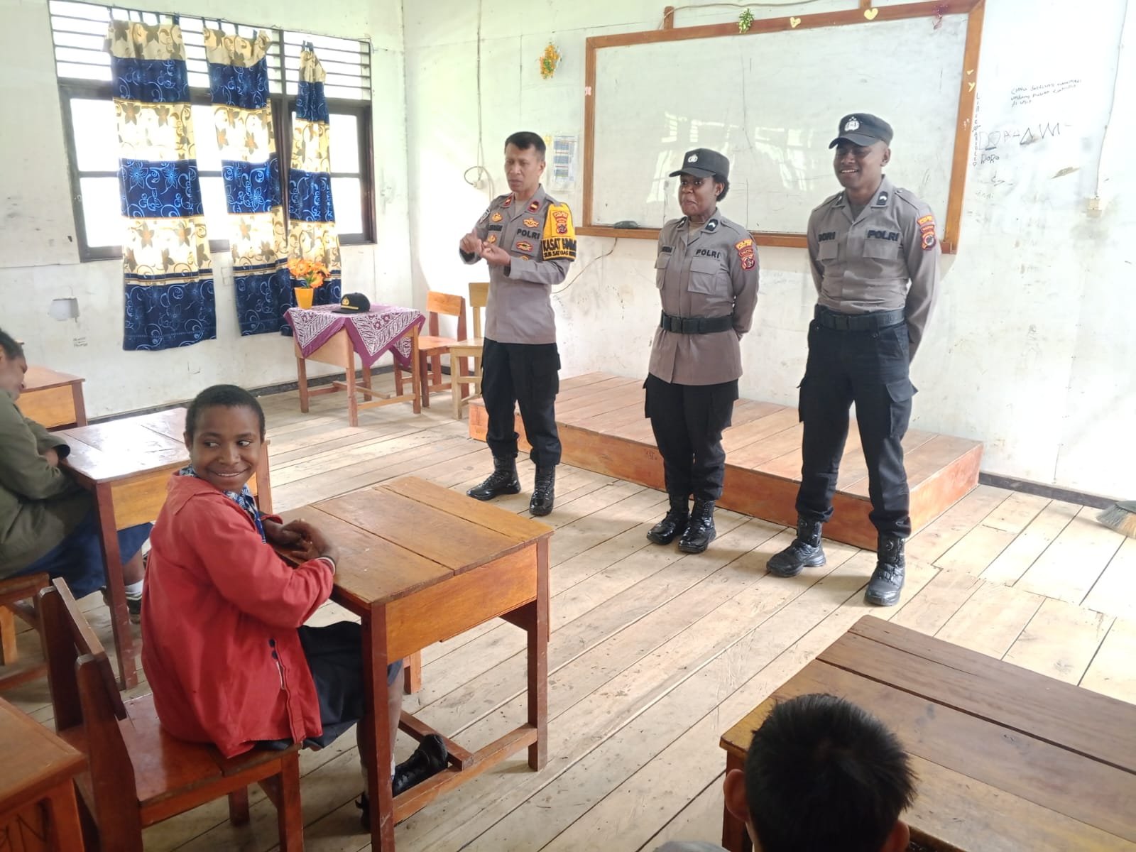 Papua — Personel kepolisian melaksanakan kegiatan pembinaan dan penyuluhan kepada para pelajar di SMP Negeri 4 Kampung Yogobak, Distrik Nogi, Kabupaten Lanny Jaya, Papua Pegunungan. Kegiatan tersebut merupakan bagian dari program pembinaan masyarakat dalam rangka Operasi Rasaka Cartenz 2026.