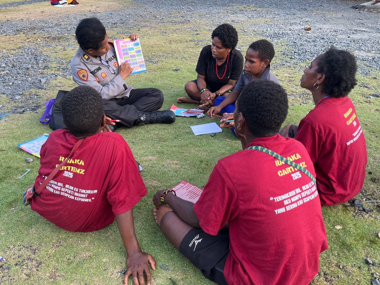 Papua – Dalam rangka mendukung peningkatan kualitas pendidikan masyarakat di wilayah binaan, Satuan Tugas Polisi Sahabat Anak Papua (Si-Ipar) Operasi Rasaka Cartenz 2025 Polres Jayapura kembali melaksanakan kegiatan pembelajaran bagi anak-anak dan mama-mama di Kompleks Bahtera Hebron, Kampung Doyo Baru, Distrik Waibu, Kabupaten Jayapura, Rabu (15/10/2025).