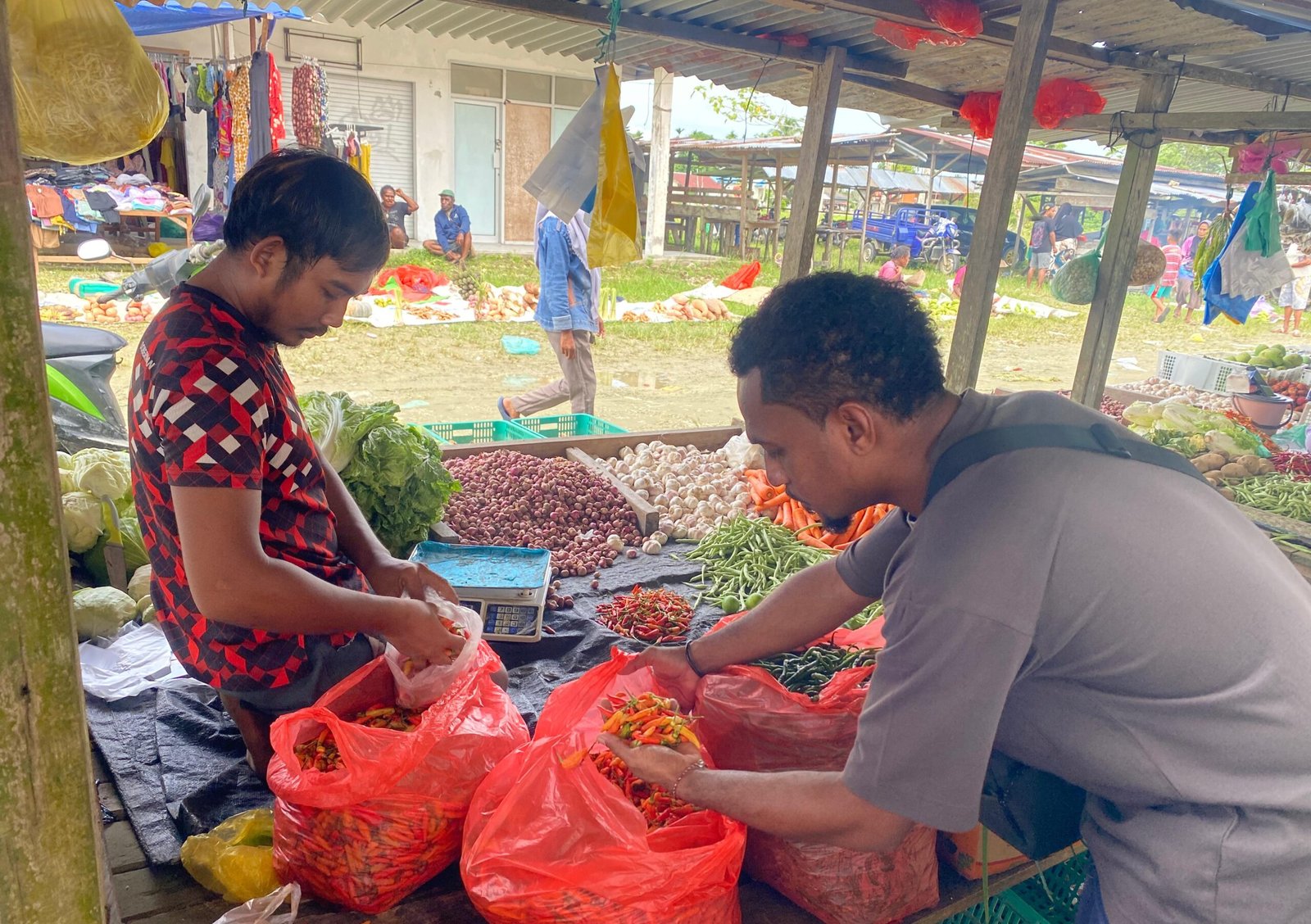 Harga cabai rawit tercatat Rp80.000 per kilogram, sementara cabai keriting atau cabai padang dijual Rp60.000 per kilogram. Selain itu, kacang hijau dijual Rp35.000 per kilogram, kacang tanah Rp34.000 per kilogram, kacang merah Rp50.000 per kilogram, serta kacang kedelai Rp45.000 per kilogram.