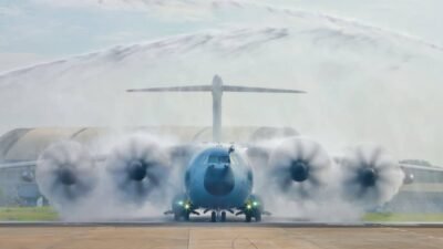 Jakarta – Tradisi water salute menandai kedatangan pesawat Airbus A400M/MRTT pertama Indonesia di Lanud Halim…