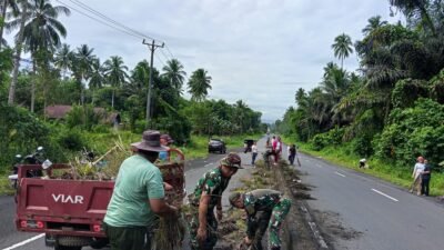 Koramil 04/Dimembe Gotong-Royong Bersama Masyarakat Bersihkan Jalan Utama
